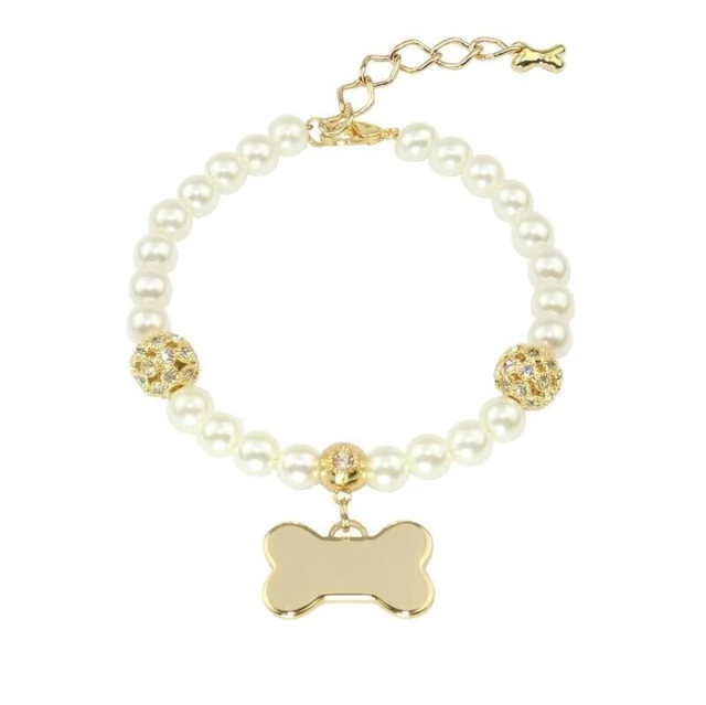 Confeccionado com pérolas ABS (não descascam), fios internos em cabo de aço (super resistente). Acabamentos em Strass dourado. Acompanha um pingente osso gravável.