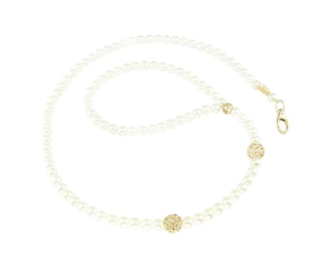 Um luxo de guia. Assim podemos apresentar a Guia Pérola Dourada Strass. Confeccionada com Pérola ABS (não descascam) , uma camada interna com cabo de aço super-resistente suportando até 120 kg e mosquetão com suporte de carga para 45 kg (Produto exclusivo, elaborado e desenvolvido pela Au Au MiauCompany), detalhes em strass dourado.